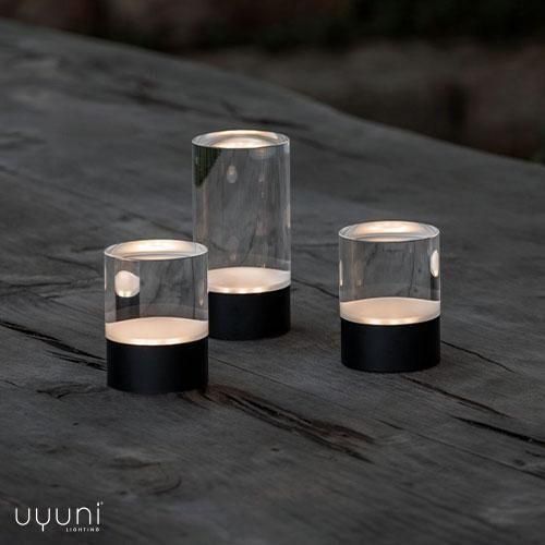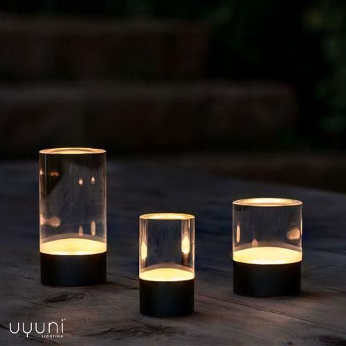 黒のベースにクリアな光源部分が浮かぶように光る様は非常に幻想的で、モダンな空気をまといます。サイズも3種類から選ぶことができ、複数灯置いてリズムのあるライティングを楽しむこともできます。ささやかで柔らかい光は特にテラスなど、半屋外空間で安らぎの空間を作り出します。