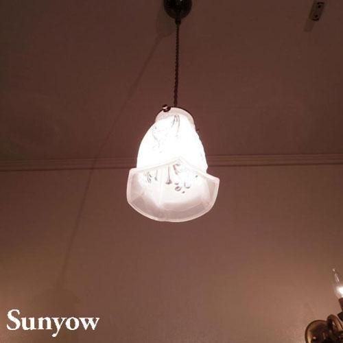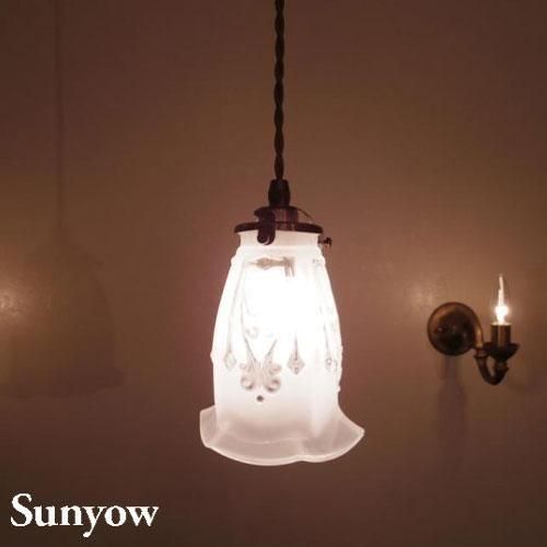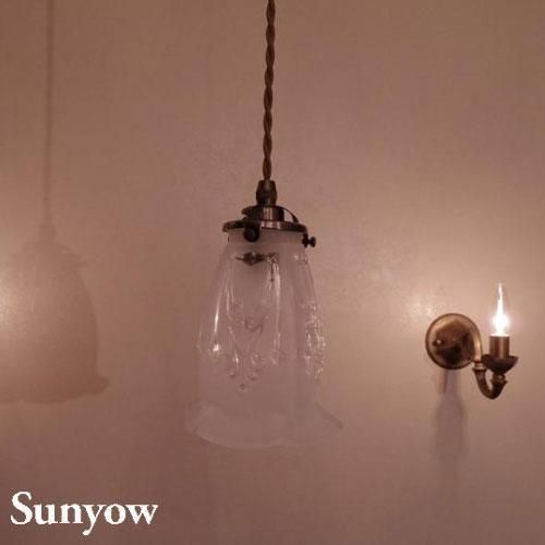 ヨーロッパで1930年代から40年代にかけて製造されていた製品をモチーフとしたアンティーク調の照明器具の製造販売を展開する「SUNYOW(サンヨウ)」のガラスペンダント。手作りならではの美しいカットが特徴的ガラスシェードは柔らかいラインが印象的。ガラス表面にあるエレガントでしなやかな品のある模様がとても魅力的です。素材には無垢の真鍮をふんだんに使用し、あえて防錆加工を施さない事で時間と共に変化するその味わい深い風合いをお楽しみ頂けます。また独自のアンティーク加工が施してあり、お手元に届いた時点でその長い時間を経たかのような風合いにてご使用頂けます。
