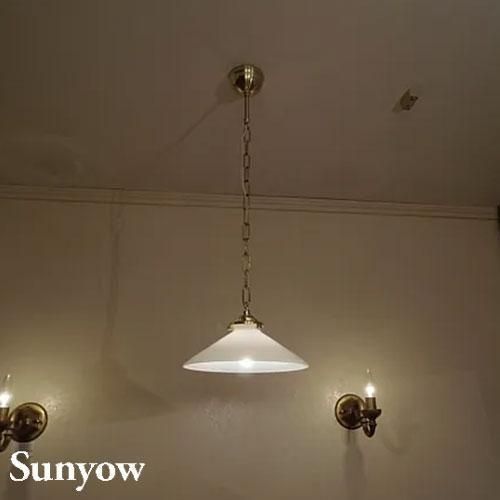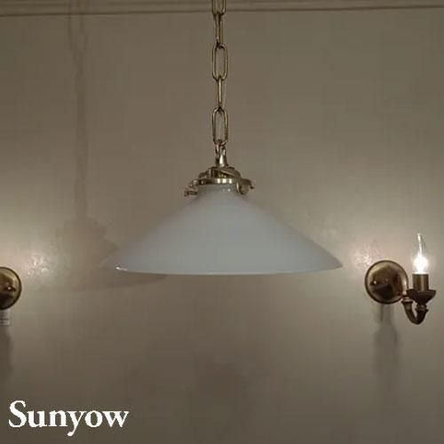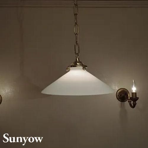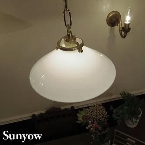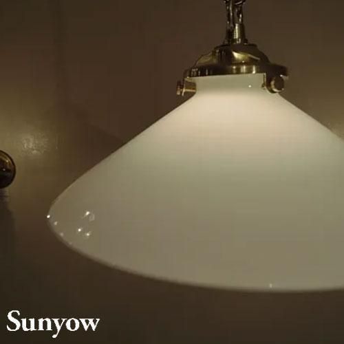 ヨーロッパで1930年代から40年代にかけて製造されていた製品をモチーフとしたアンティーク調の照明器具の製造販売を展開する「SUNYOW(サンヨウ)」のガラスペンダント。真っ白でシンプルなガラスシェードにゴールドのソケットを組み合わせた、クラシカルな雰囲気。素材には無垢の真鍮をふんだんに使用し、あえて防錆加工を施さない事で時間と共に変化するその味わい深い風合いをお楽しみ頂けます。また独自のアンティーク加工が施してあり、お手元に届いた時点でその長い時間を経たかのような風合いにてご使用頂けます。