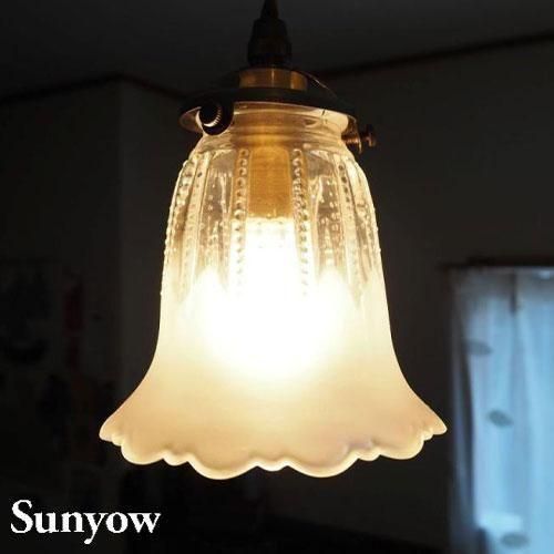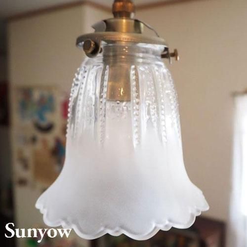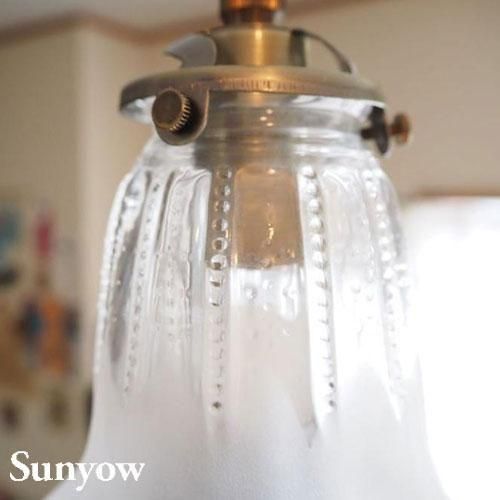 ヨーロッパで1930年代から40年代にかけて製造されていた製品をモチーフとしたアンティーク調の照明器具の製造販売を展開する「SUNYOW(サンヨウ)」のペンダント。手作りならではの美しいカットが特徴的ガラスシェードは想像力をくすぐるような独特のカットが施されたデザインが印象的。さらに映し出される光の模様も楽しめる照明です。素材には無垢の真鍮をふんだんに使用し、あえて防錆加工を施さない事で時間と共に変化するその味わい深い風合いをお楽しみ頂けます。また独自のアンティーク加工が施してあり、お手元に届いた時点でその長い時間を経たかのような風合いにてご使用頂けます。